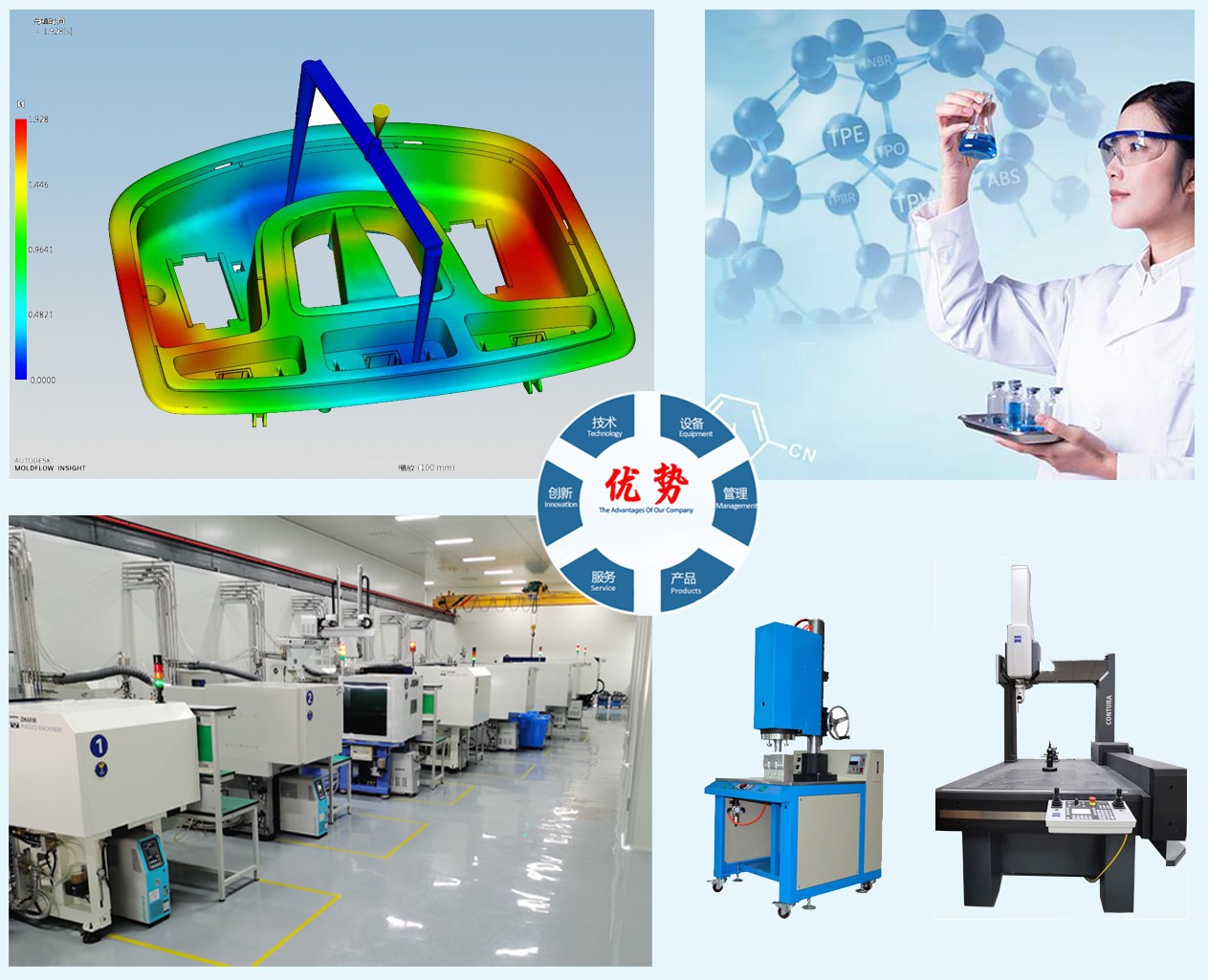 ???????公司具備高分子材料改性與選型、模具設計與制造、高分子構件成型(通用注塑、結構發泡注塑、氣輔注塑、PPSU高溫注塑、無磁注塑)以及表面后處理、大型組件裝配等一站式解決方案的能力,擁有注塑量1克-15000克、鎖模力60噸-2400噸的注塑成型機近20臺,金屬加工機床40余臺,進口氣體輔助設備和三坐標、長度、熱工、壓力、理化等測試設備,具備承攬各類工程塑料加工能力。
